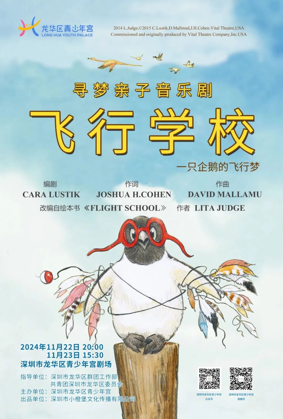 活動簡介:尋夢親子音樂劇《飛行學校》即將于11月22日、23日在深圳市龍華區青少年宮劇場上演。該劇講述了一只小企鵝在飛行學校中,與性格各異的小伙伴共同學習飛行、克服困難、實現夢想的勵志故事。音樂劇以立體童話形式呈現,旨在通過正能量和勵志的情節,提升孩子的藝術素養和審美能力。