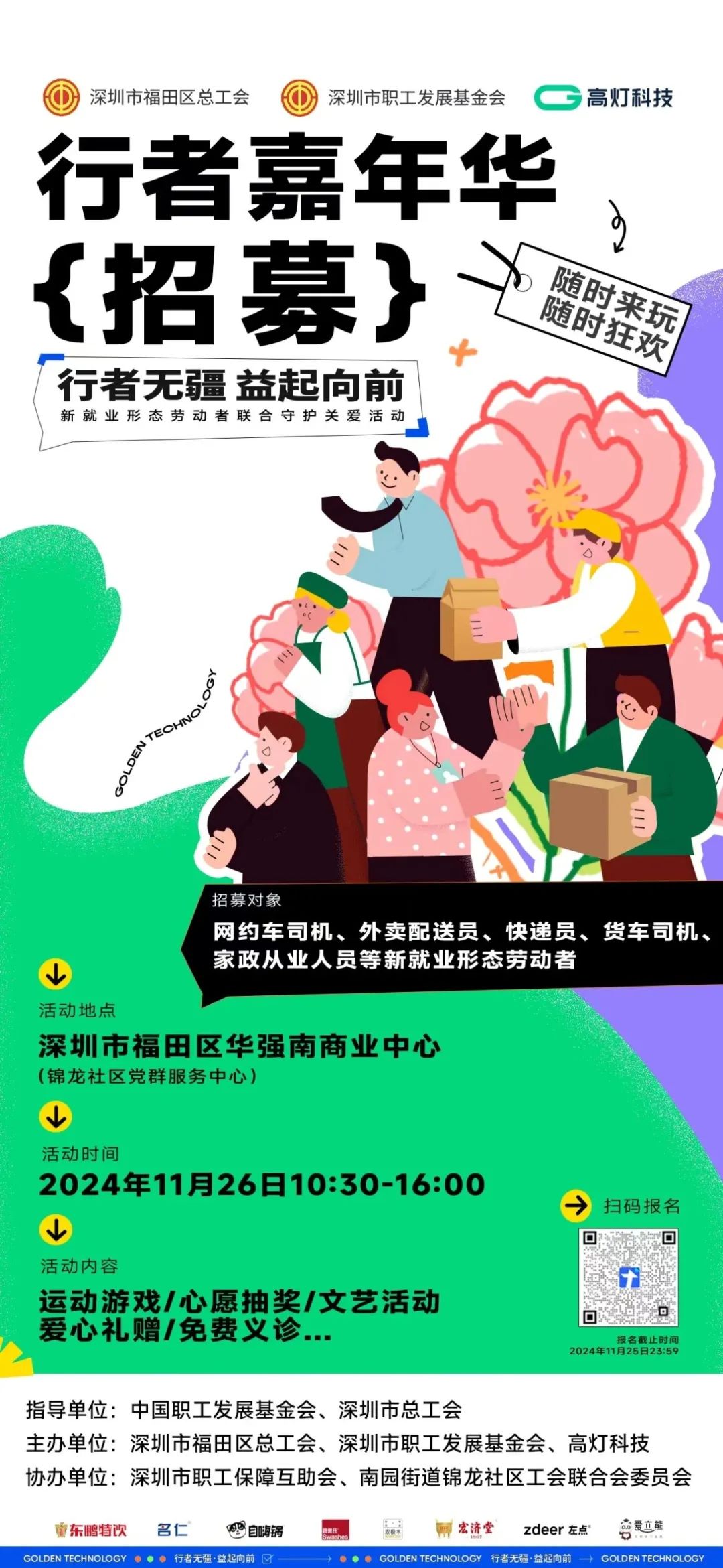 活動簡介:在中國職工發展基金會、深圳市總工會的指導下,福田區總工會聯合深圳市職工發展基金會、深圳市職工保障互助會以及高燈科技等愛心企業,精心籌備了一場專屬于新就業形態勞動者的嘉年華,讓每一位在都市中奔波的行者,都能感受到家的溫暖與關懷。現誠邀所有新就業形態的勇者——網約車司機、外賣配送員、快遞員、貨車司機、家政從業人員等新就業形態勞動者參加,向你們的辛勤付出致以敬意!