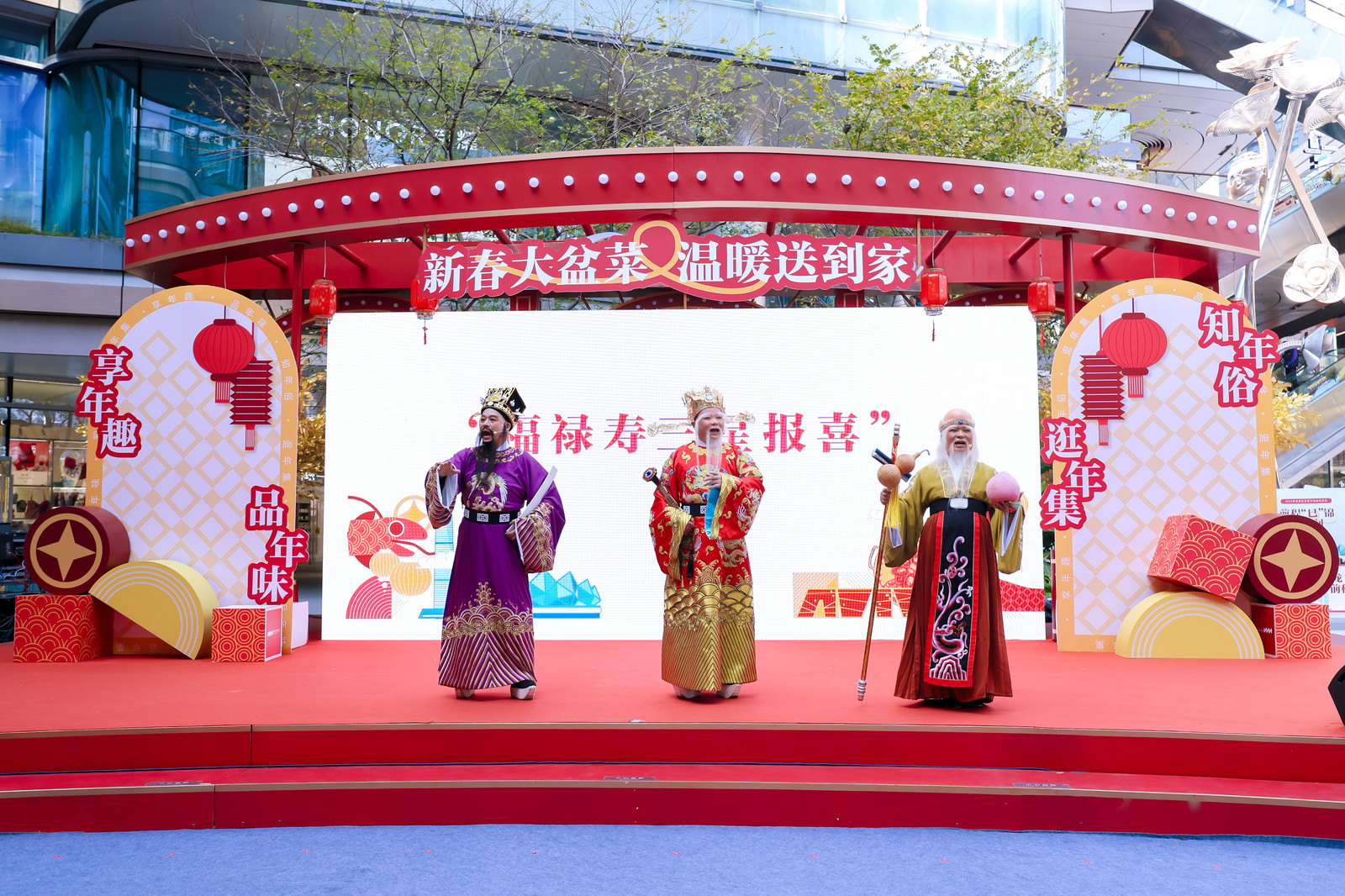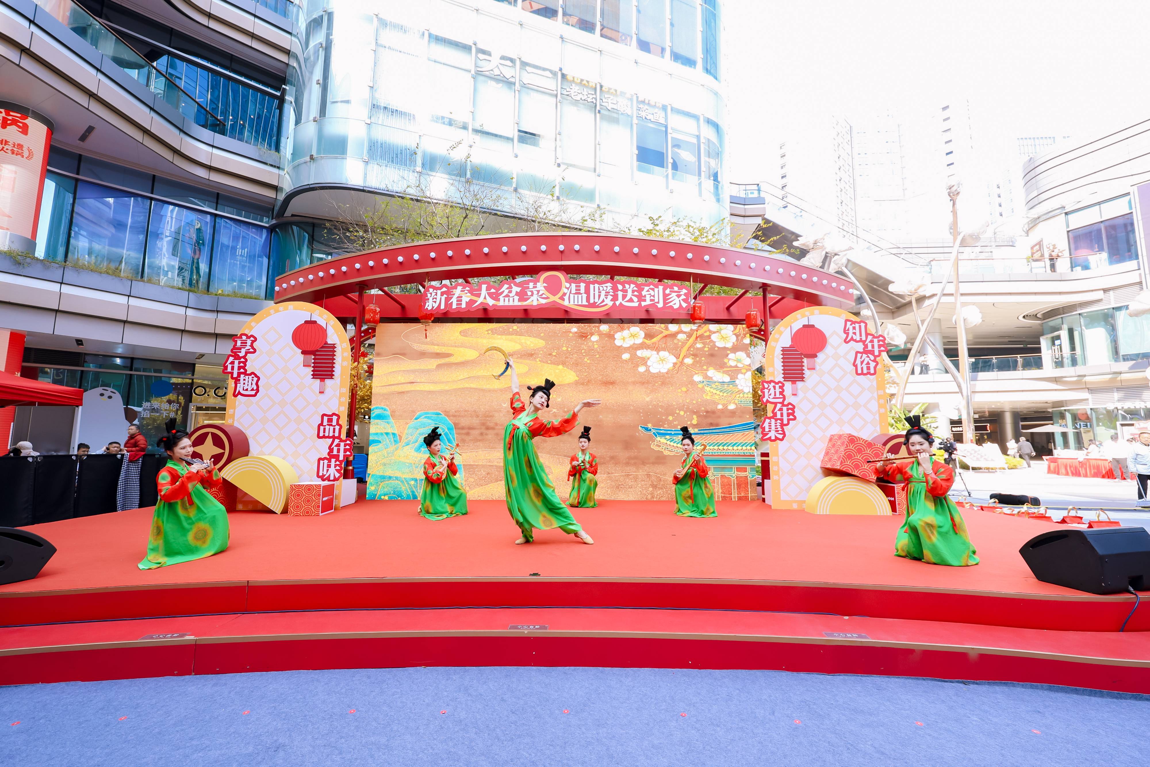 在“新春大盆菜 溫暖送到家”活動現場,龐大的金色發財樹新春裝置成為了男女老少新年祈福打卡墻;舞蹈《唐宮夜宴》驚艷登場,華服少女帶領市民穿越古風新春;“福祿壽”三星霸氣來襲,不少市民紛紛合影為新年添福……
