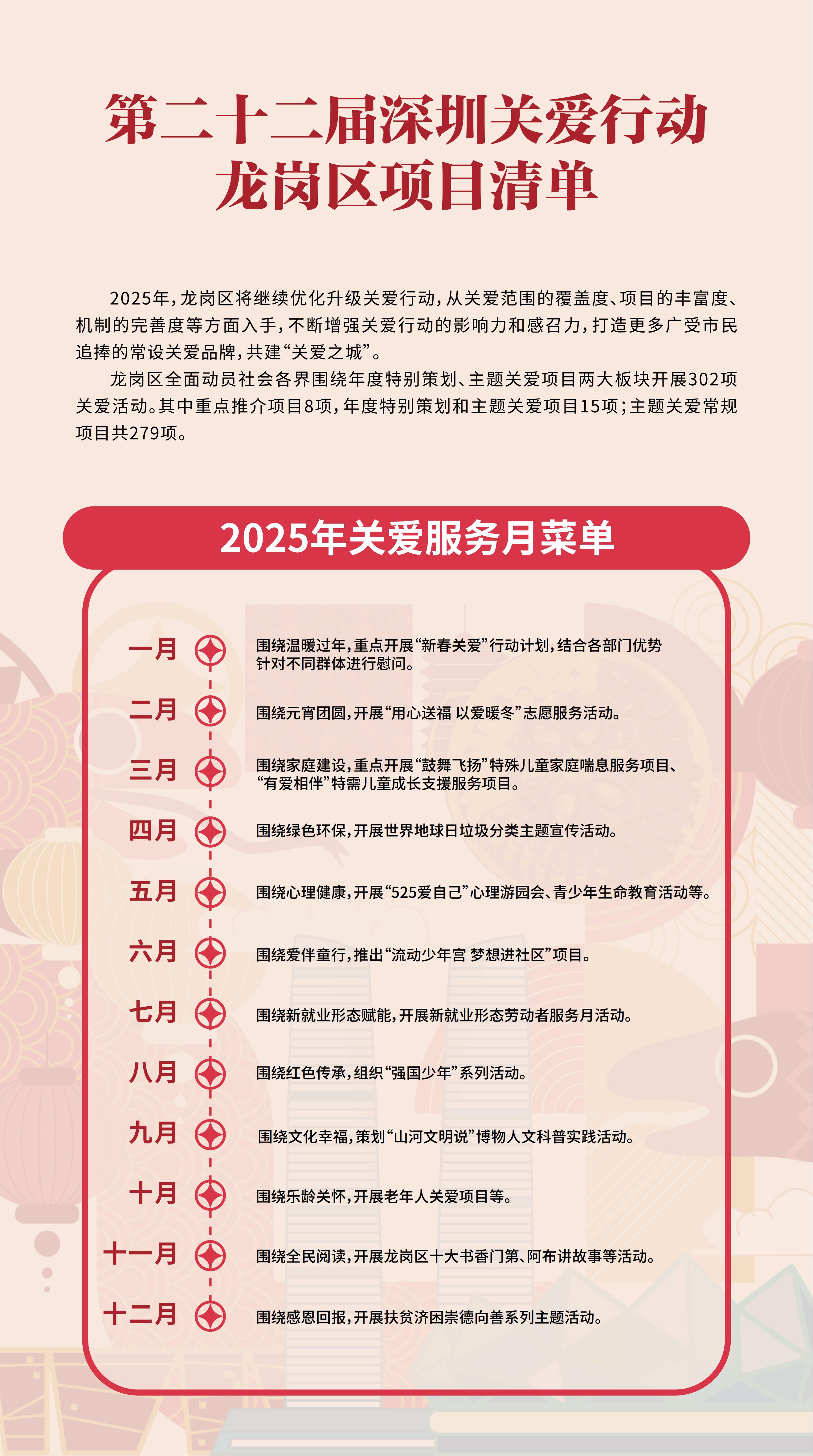 據了解,今年龍崗區全面動員社會各界圍繞“年度特別策劃”“主題關愛項目”兩大板塊開展302項關愛活動,其中重點推介項目8項,年度特別策劃和主題關愛項目15項,主題關愛常規項目279項。
